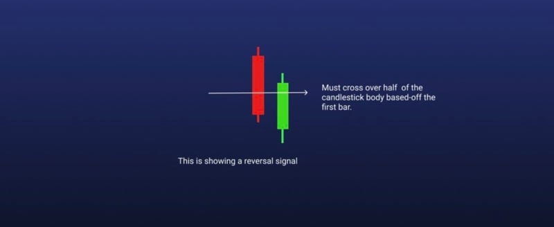 Another two-candlestick pattern is the piercing line, which may show up at the bottom of a downtrend at the support level, or during a pullback with the anticipation of a bullish movement. The pattern consists of a long red candle that’s followed by a long green candle. The critical aspect of this pattern is that there’s a significant gap between the red candle’s closing price and the green candle’s open price. The close should also cover at least half of the length of the previous day's red candlestick body. The fact that the green candle closes much higher than the open points to buying pressure.