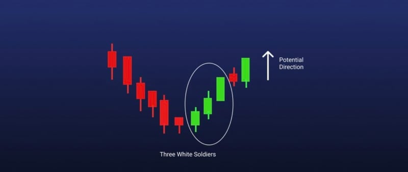 Another three-stick candle is the three white soldiers. It’s made up of three long green candles in a row, generally with very short shadows. The primary condition is that the three consecutive greens have to open and close higher than the previous period. This pattern is regarded as a strong bullish signal that shows up after a downtrend.