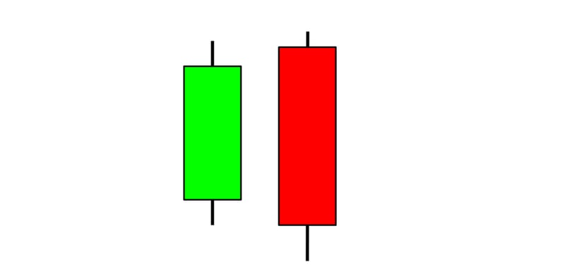 The bearish engulfing pattern is the inverted version of a bullish engulfing, so the first candle has a small green body and is completely covered by the next long red candle. This pattern comes at the peak of an uptrend and suggests a reversal. The lower the second candle continues, the more momentum the bearish move will have.